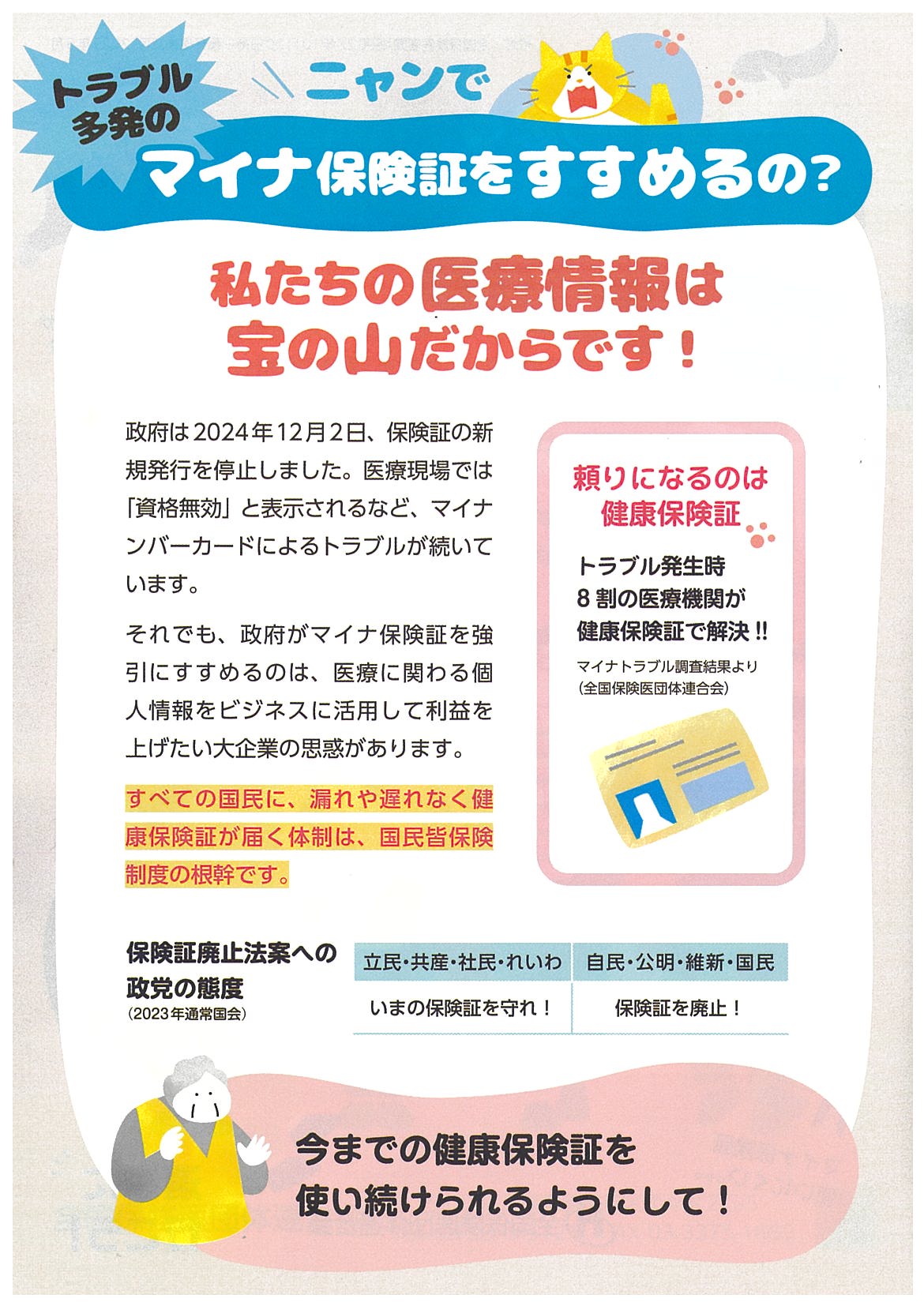 国民も、患者も、医療機関も望んでいないマイナンバーカードとの一本化はただちにやめて、現行の健康保険証を残してください