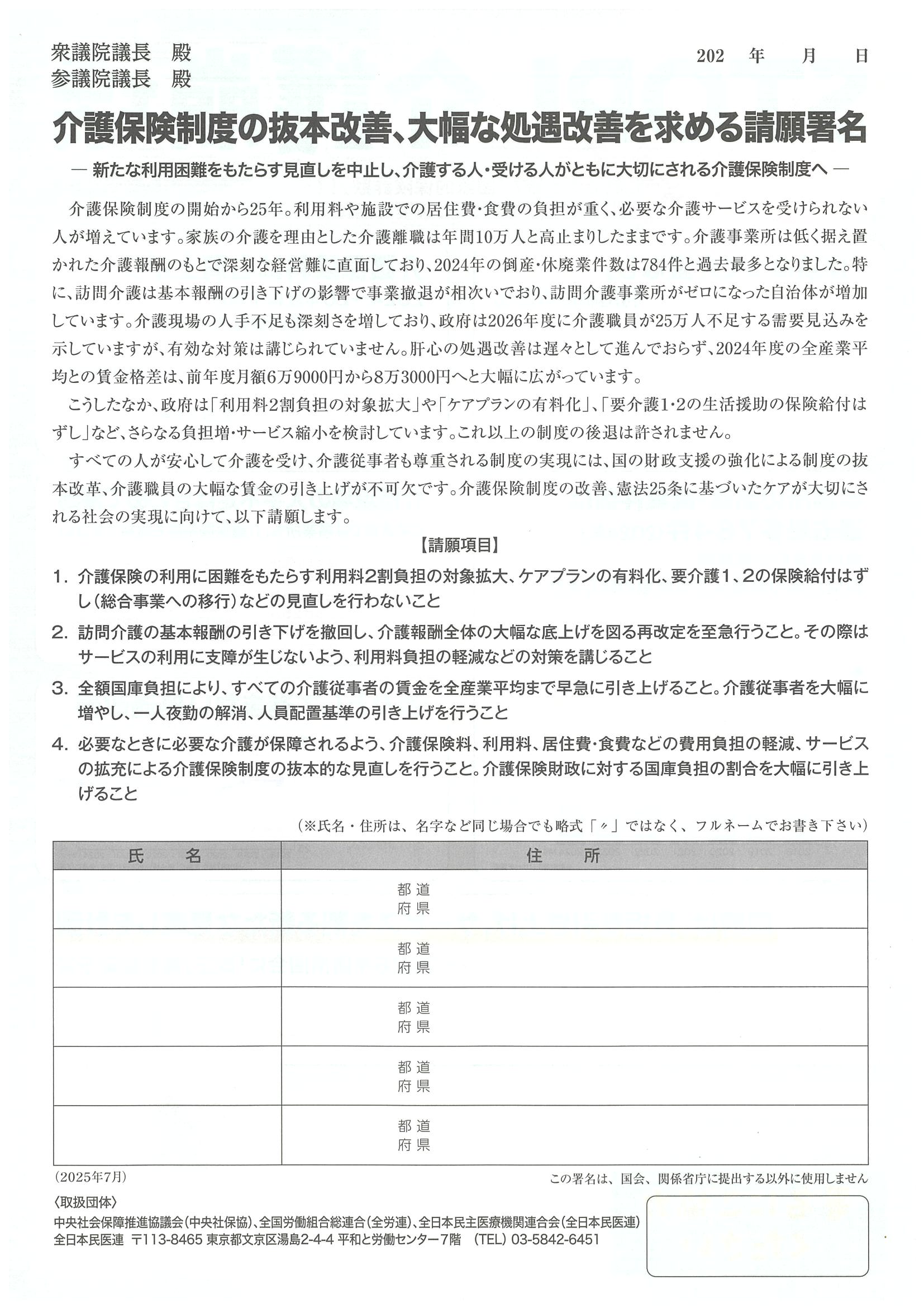 ● 介護保険制度の抜本改善、大幅な処遇改善を求める請願署名